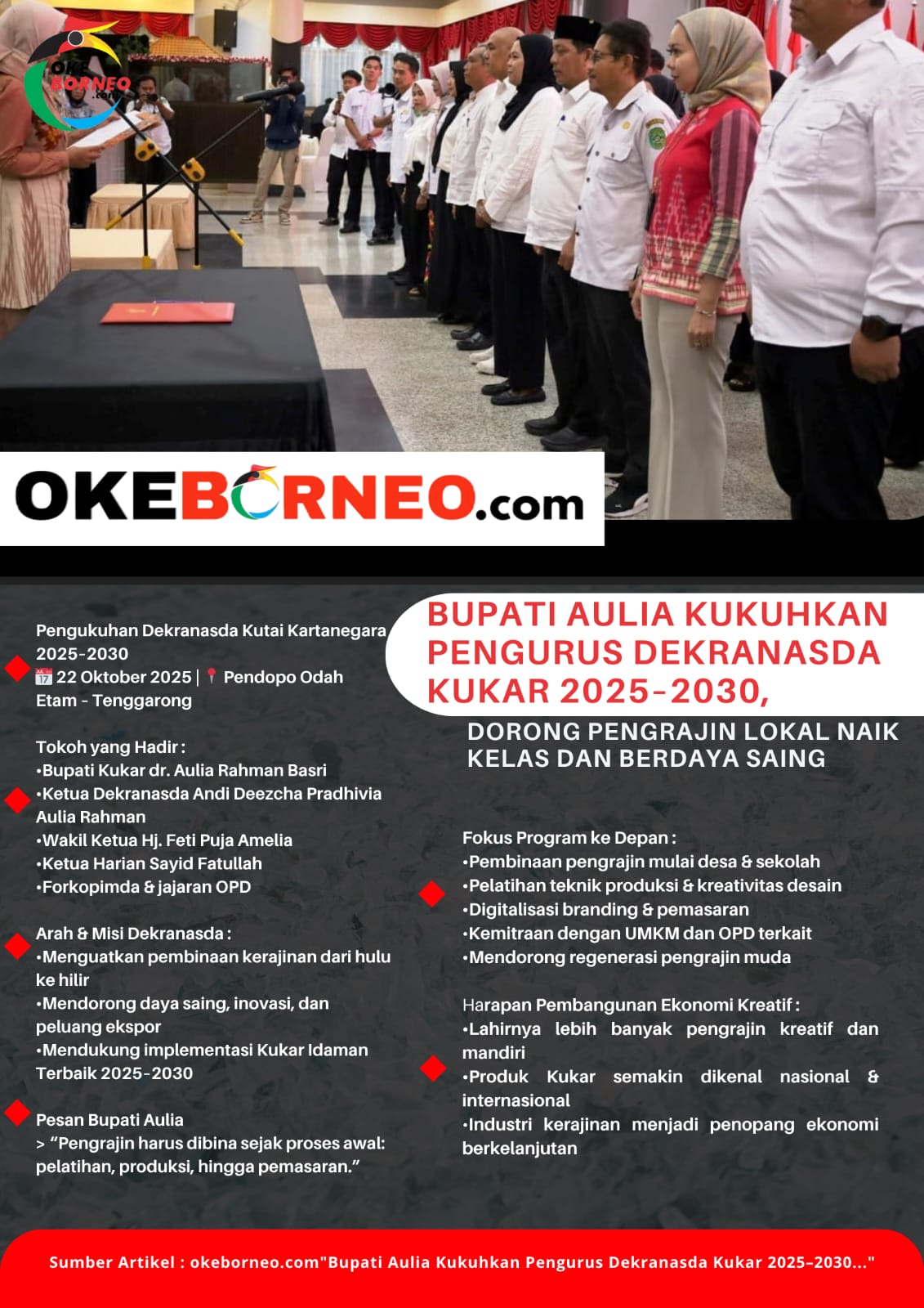 okeborneo.com, KUTAI KARTANEGARA — Bupati Kutai Kartanegara (Kukar) dr. Aulia Rahman Basri resmi mengukuhkan Pengurus Dewan Kerajinan Nasional Daerah (Dekranasda) Kabupaten Kutai Kartanegara Masa Bakti 2025–2030, Rabu (22/10/2025), di Pendopo Odah Etam, Tenggarong. Acara berlangsung khidmat dan dihadiri sejumlah pejabat daerah, pengrajin, serta tokoh masyarakat.