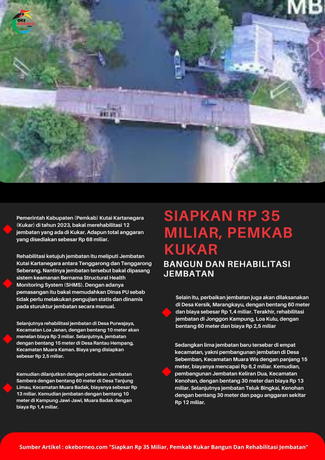 okeborneo.com, KUTAI KARTANEGARA – Pemerintah Kabupaten (Pemkab) Kutai Kartanegara (Kukar) di tahun 2023, bakal merehabilitasi 12 jembatan yang ada di Kukar. Adapun total anggaran yang disediakan sebesar Rp 68 miliar.