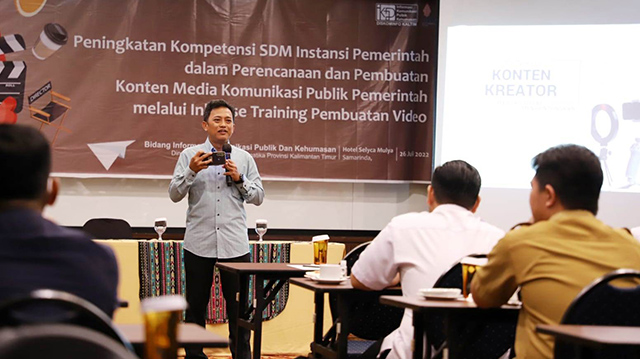 okeborneo.com, SAMARINDA – Mendukung upaya peningkatan kapasitas jajaran Dinas Kominfo Kaltim sebagai Government Public Relations, sengaja digelar pelatihan membuat konten video dengan mengundang dua praktisi. Pelatihan yang diikuti jajaran Diskominfo Kaltim juga diikuti Diskominfo Kabupaten dan Kota lainnya di Kaltim itu, digelar di Hotel Selyca Mulia Samarinda, (26/7/2022) tadi.