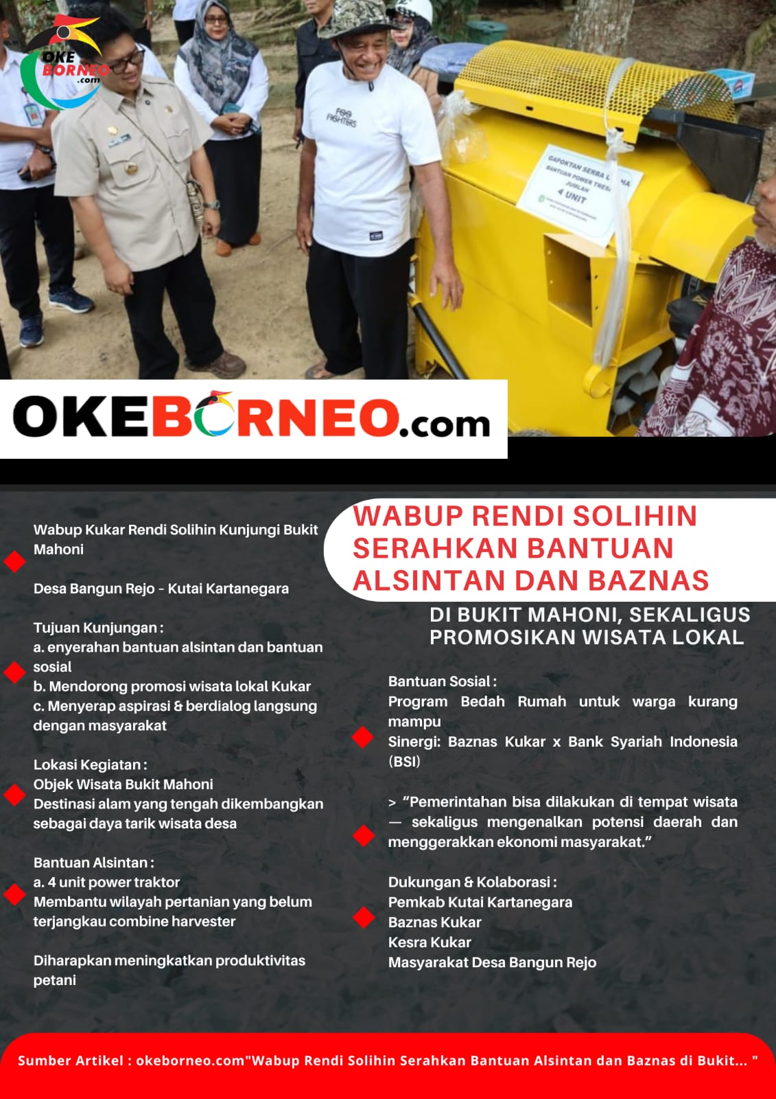 okeborneo.com, KUTAI KARTANEGARA — Wakil Bupati Kutai Kartanegara (Kukar) Rendi Solihin melaksanakan kunjungan kerja ke Objek Wisata Bukit Mahoni, Desa Bangun Rejo. Dalam kesempatan tersebut, ia menyerahkan bantuan alat mesin pertanian (alsintan), bantuan dari Baznas dan Kesra, serta berdialog langsung dengan masyarakat setempat, Rabu (5/11/2025).